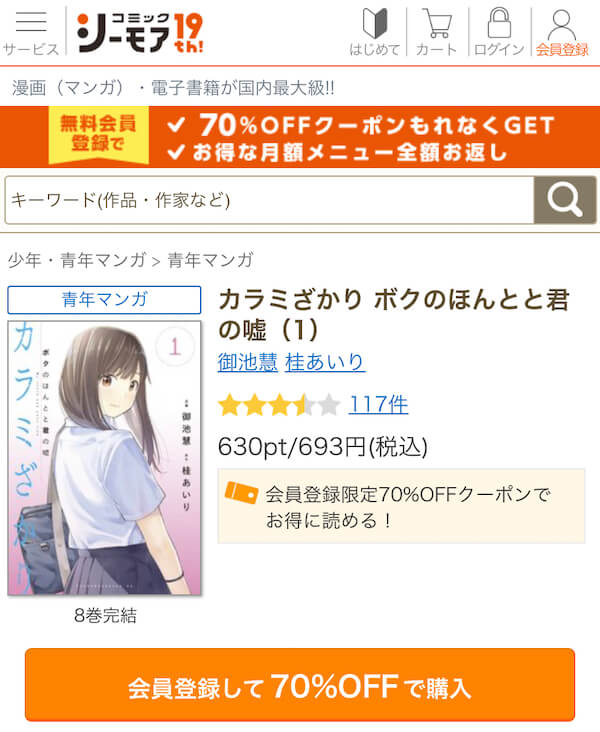 コミックシーモアは、無料の会員登録をするだけで漫画『カラミざかり』でも利用できる初回全員が1冊70%OFFクーポンがもらえます。